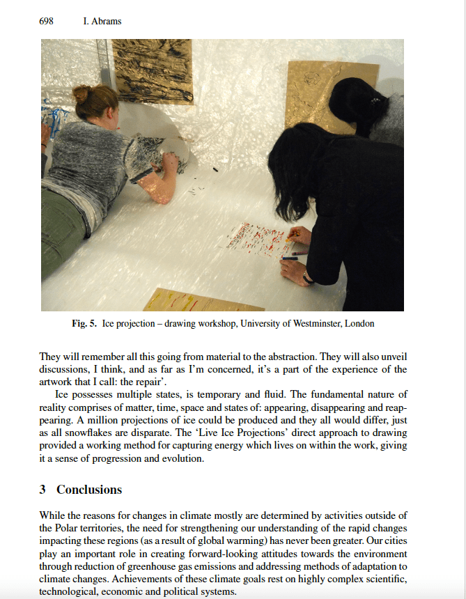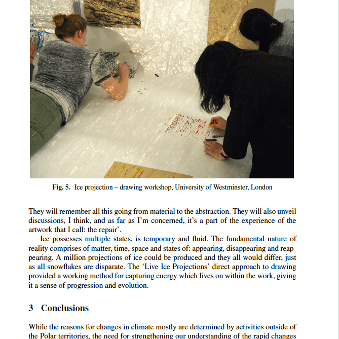 The article explores from the human perspective the role of individual actions and how artists /designers can stimulate awareness at a local /grassroots level to help address and understand unpredictable and random influences that exist in our constantly changing climate and environment. The paper demonstrates benefits of incorporating public collaboration and participation into ‘the Environmental Debate’ and the value of empowering people through better connection with their environment to help them develop a greater understanding and resilience in dealing with issues relating to the climate change. The empirical methodology of the research involved designing and testing models of participatory processes relating to the ambient and ephemeral properties of ice to help the public reflect on their relationship to the environment.